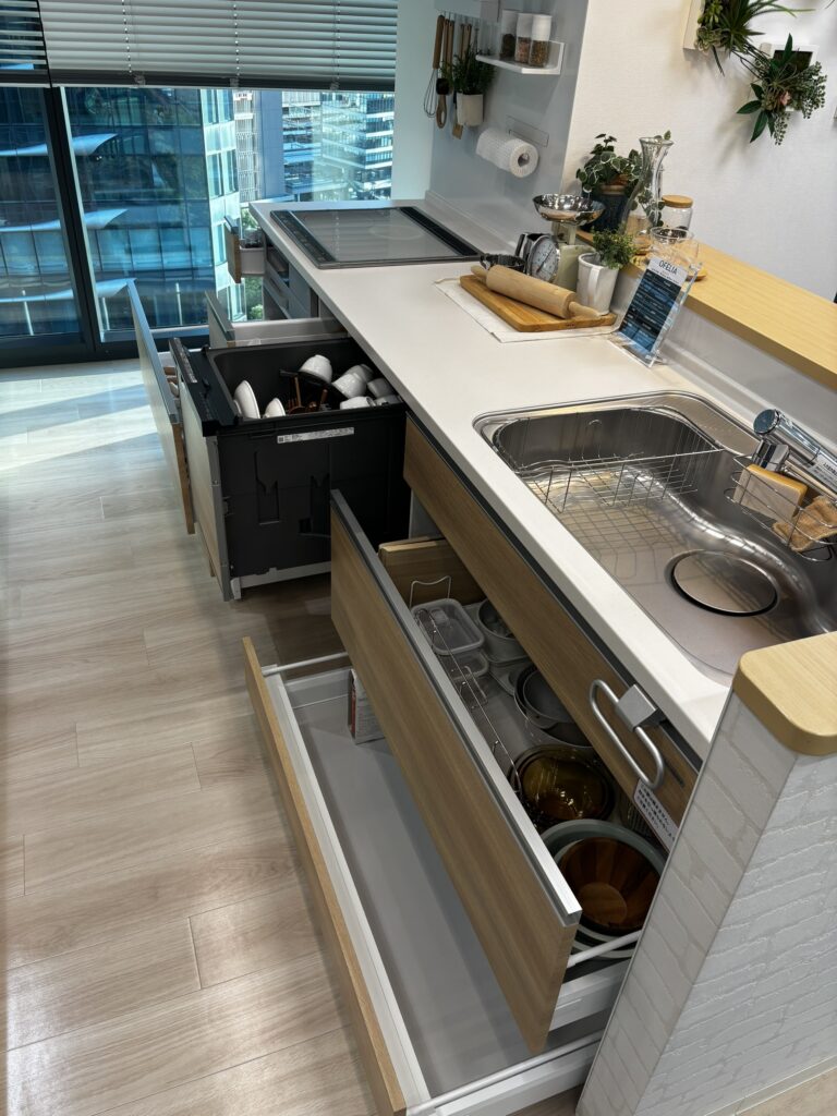 そして大収容量の引き出しの中にも実際の調理器具も設置して展示してるので更に自分のライフスタイルを想像しながら想像しやすいですよね!