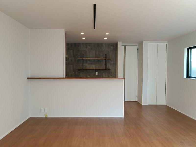 すっきりとしたハイドアの横にはリビング収納もありますので、散らかりがちな書類や、リビングで使う細々したモノを収納して頂けます。